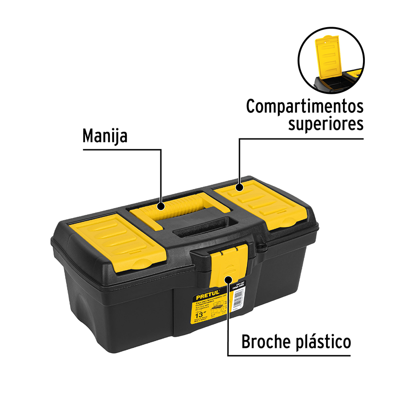 - Compartimentos superiores en la tapa para almacenar piezas pequeñas sin necesidad de abrir la caja