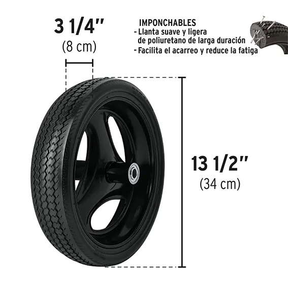 - Llanta imponchable suave y ligera de poliuretano con rin 3 aspas, facilita el acarreo y reduce la fatiga