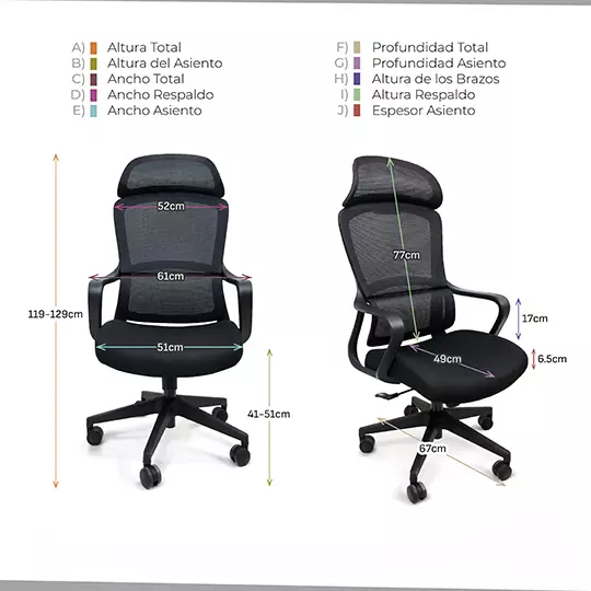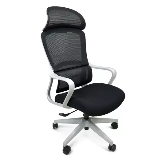 Silla ergonómica ejecutiva reclinable con descansabrazos y cabecera, ajuste neumático de altura, mecanismo con control de tensión y bloqueo de reclinación, respaldo en malla y asiento en tela color negro y estructura gris. Dimensiones: altura total 119-129 cm, altura asiento 41-51 cm, ancho 67 cm.