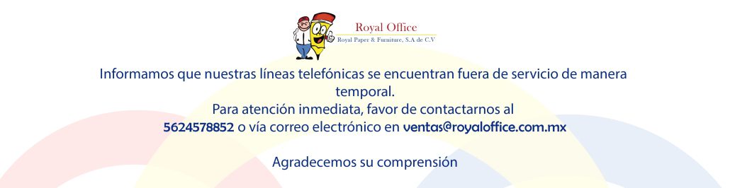 Informamos que nuestras líneas telefónicas se encuentran fuera de servicio de manera temporal. Para atención inmediata, favor de contactarnos al 5624578852 o vía correo electrónico en ventas@royaloffice.com.mxGracias por su comprensión. Descartar