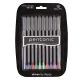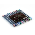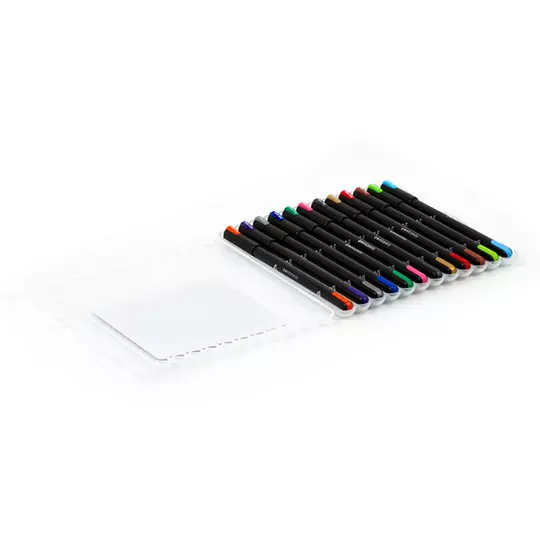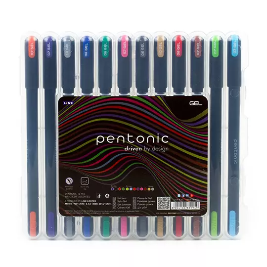 12 colores: Morado, azul, verde, verde limón, azul cielo, rosa, naranja, rojo, café, negro, dorado y plateado, 3 puntas de bolígrafo diferentes: extra fina de 0.6 mm, fina de 0.7 mm y media de 1.0, barril de plástico redondo mate, viscocidad media, tinta hidrofóbica (repelente a cualquier líquido).