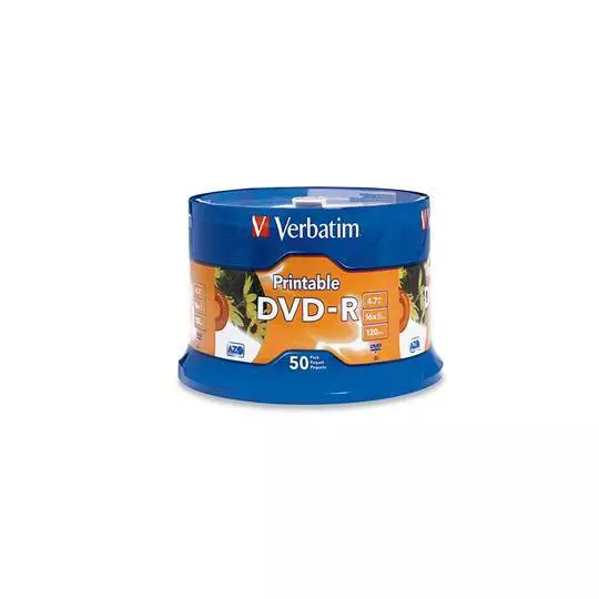 Torre con 50 discos DVD. Capacidad de almacenamiento de 4,7 GB/120 minutos. Hasta 16X de velocidad de escritura. Cree etiquetas a todo color, de alta calidad, usando su impresora de discos de inyección de tinta.