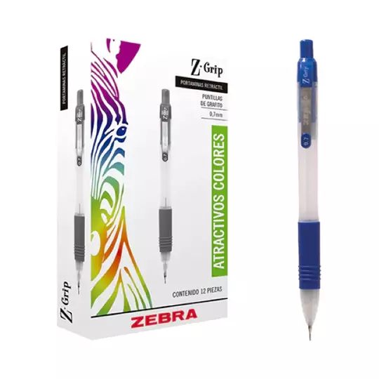 Portaminas de plastico transparente con grip de goma, clip metalico y borrador, punto 0.7 mm, caja con 12 piezas.