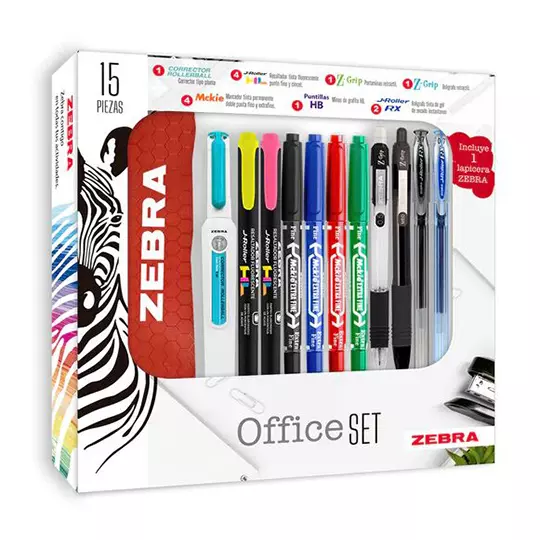 Set de oficina Zebra con: 1 lapicera, 1 corrector en pluma, 4 resaltadores doble punta, 4 marcadores doble punta, 1 portaminas, 1 paquete de puntillas, 1 bolígrafo retráctil y 2 bolígrafos tinta gel.